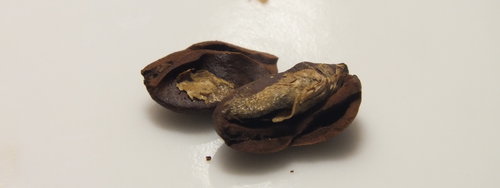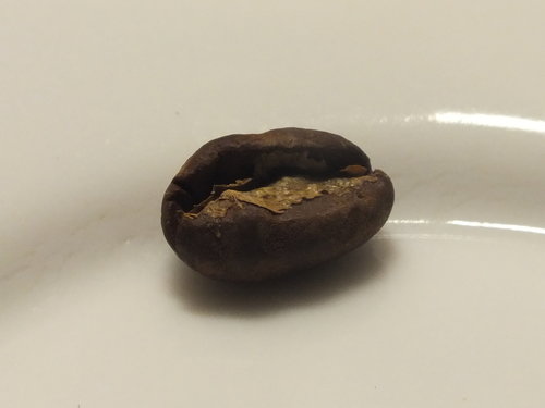 剝開以後顏色較淡的這顆豆子可以看得出胚芽都還在(烘焙溫度真的超過300度C唷!!)