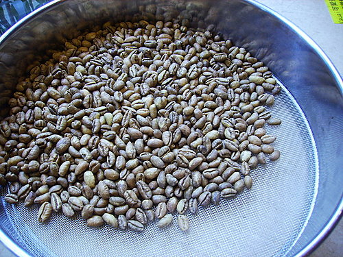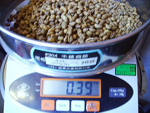 2公斤的生豆,在剔除了破碎及些許的瑕疵豆,在精挑出的丸豆就只有390公克了