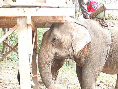 只見象夫引導大象將頭鑽到檯子底下方便我們踏著他的脖子到背上坐好