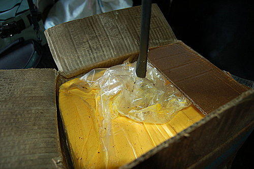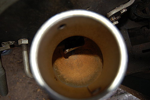 鐺鐺...主角出現了.這桶牛油是咖啡變的香濃的主角喔!在咖啡下鍋前挖一瓢牛油.牛油受熱以後會包覆在咖啡豆的外圍.冷卻以後這層油會被吸到咖啡豆裡面.在泡咖啡時遇熱就會釋放出來.如此一來您喝的咖啡就會有濃濃的奶香喔!(想想咖啡放一段時間之後牛油發酵後的味道吧